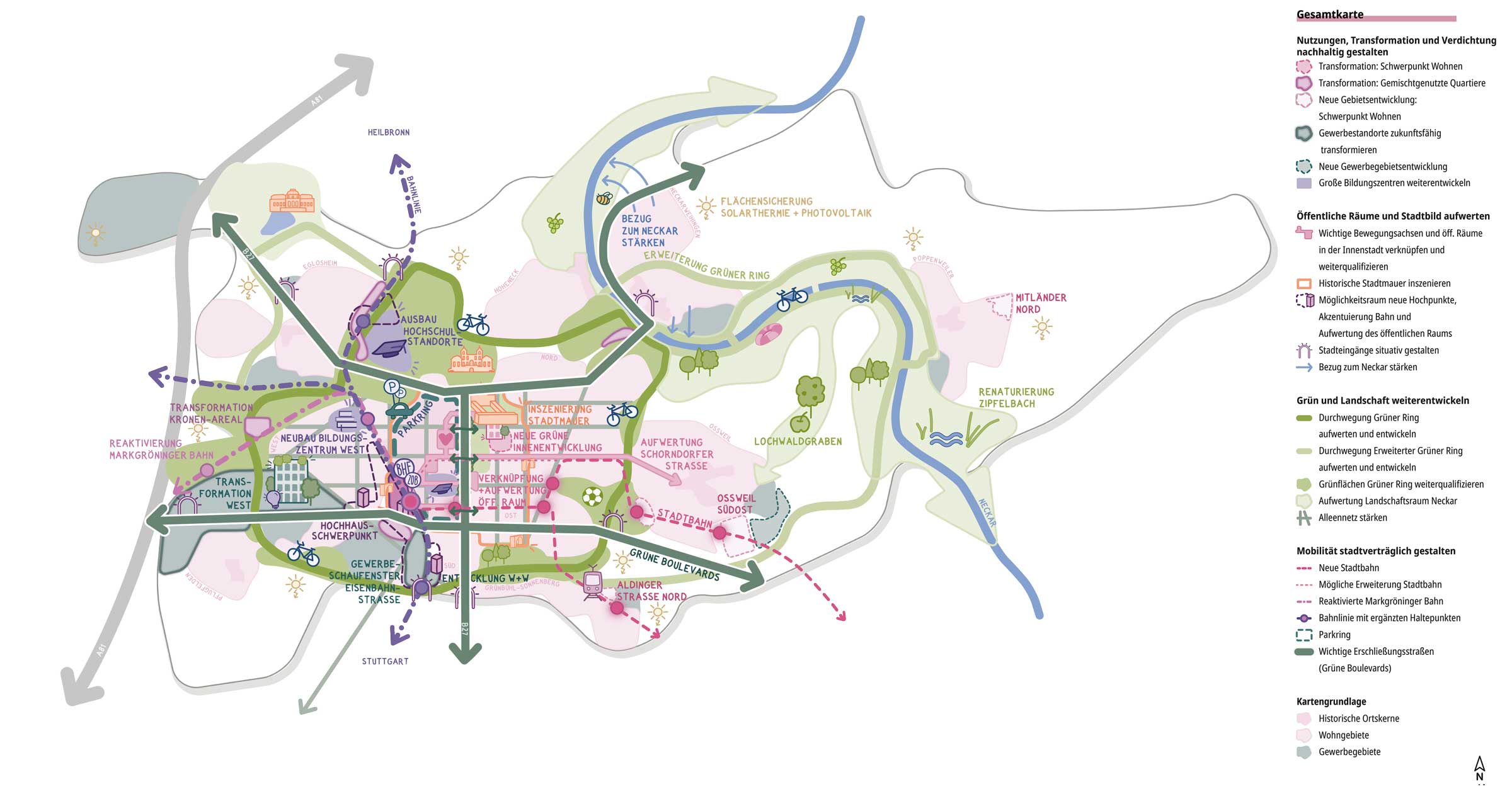 Die Gesamtskizze bietet eine vereinfachte Darstellung des Konzepts und bündelt alle Vorstellungen für die künftige Entwicklung Ludwigsburgs. Zusätzlich gibt es die themenbezogenen Skizzen, sowie themenbezogene Ziele: