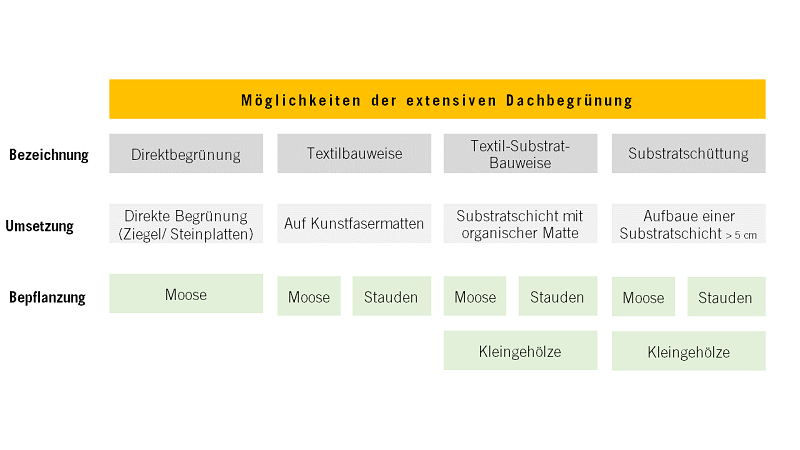 Zur Realisierung einer einfachen Dachbegrünung (auch extensive Dachbegrünung genannt) gibt es unterschiedliche Möglichkeiten.