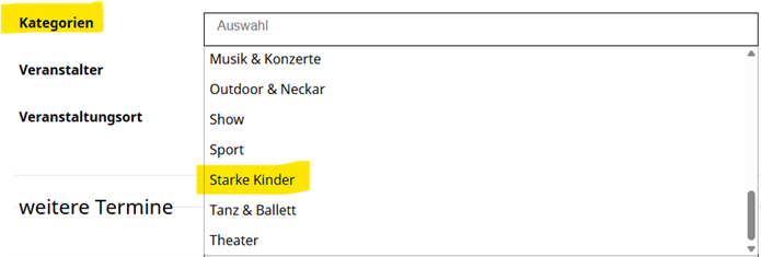 Wenn Ihre Aktion hier ebenfalls angezeigt werden soll, erfassen Sie diese als Veranstalter*in bitte selbst im Veranstaltungskalender per Selbsteintrag und wählen Sie unter „Kategorie“ „Starke Kinder“ aus, damit der Eintrag technisch zugeordnet werden. Hier finden Sie die komplette Anleitung zum Anlegen eines Selbsteintrags.