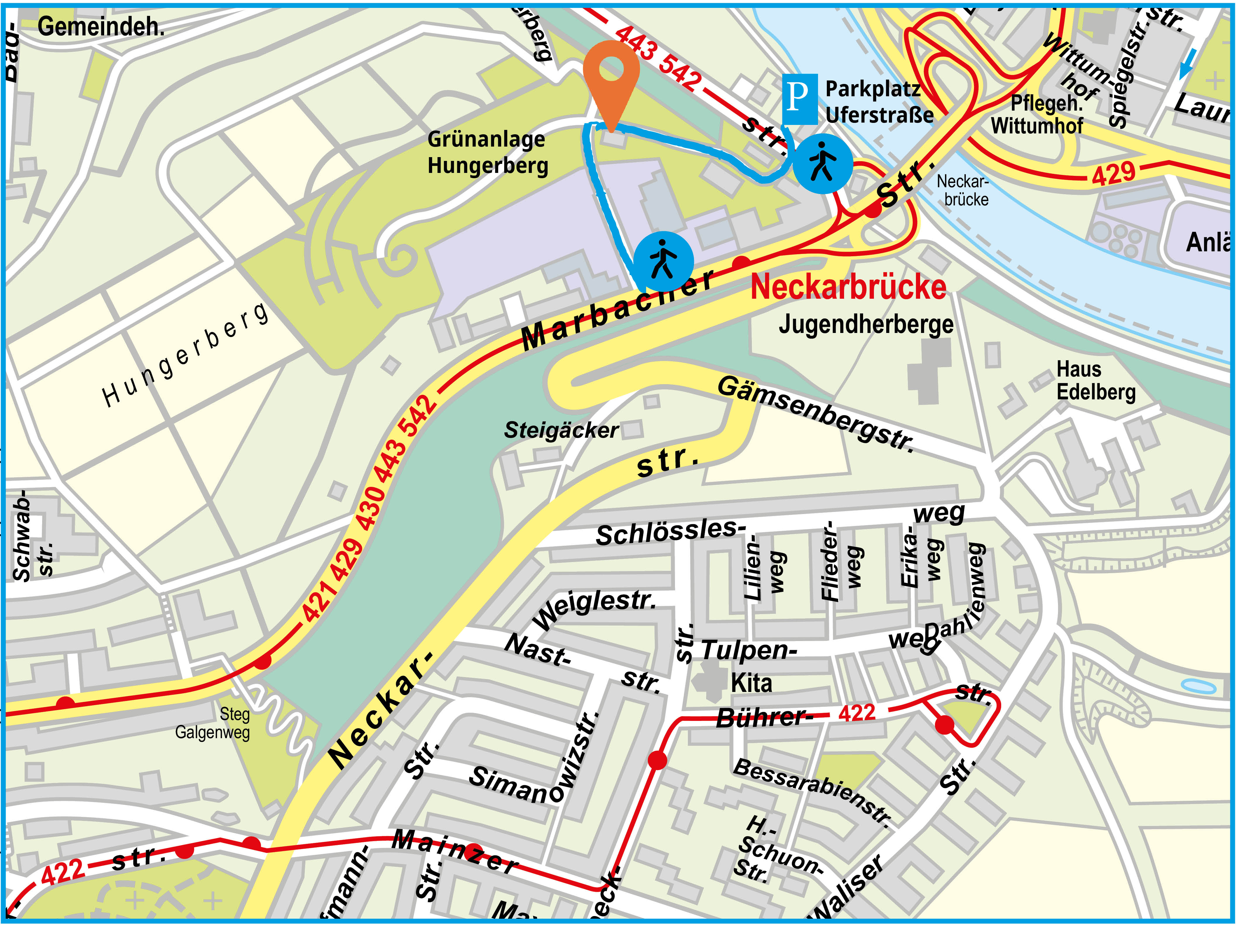 Anfahrt mit ÖPNV zur Haltestelle Neckarbrücke mit den Linien 429/430/421.