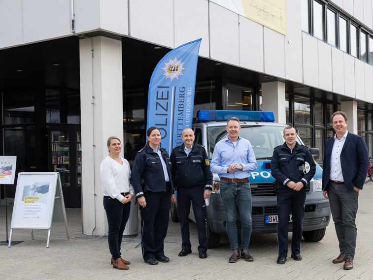 rechts nach links: Oberbürgermeister Herr Dr. Knecht, Revierleiter der Polizei Herr Passaro, Bürgermeister Herr Mannl, Herr Räuchle und Frau Glück von der Polizei, Referat Prävention und die Präventionsbeauftragte der Stadt Ludwigsburg Frau Pirkner