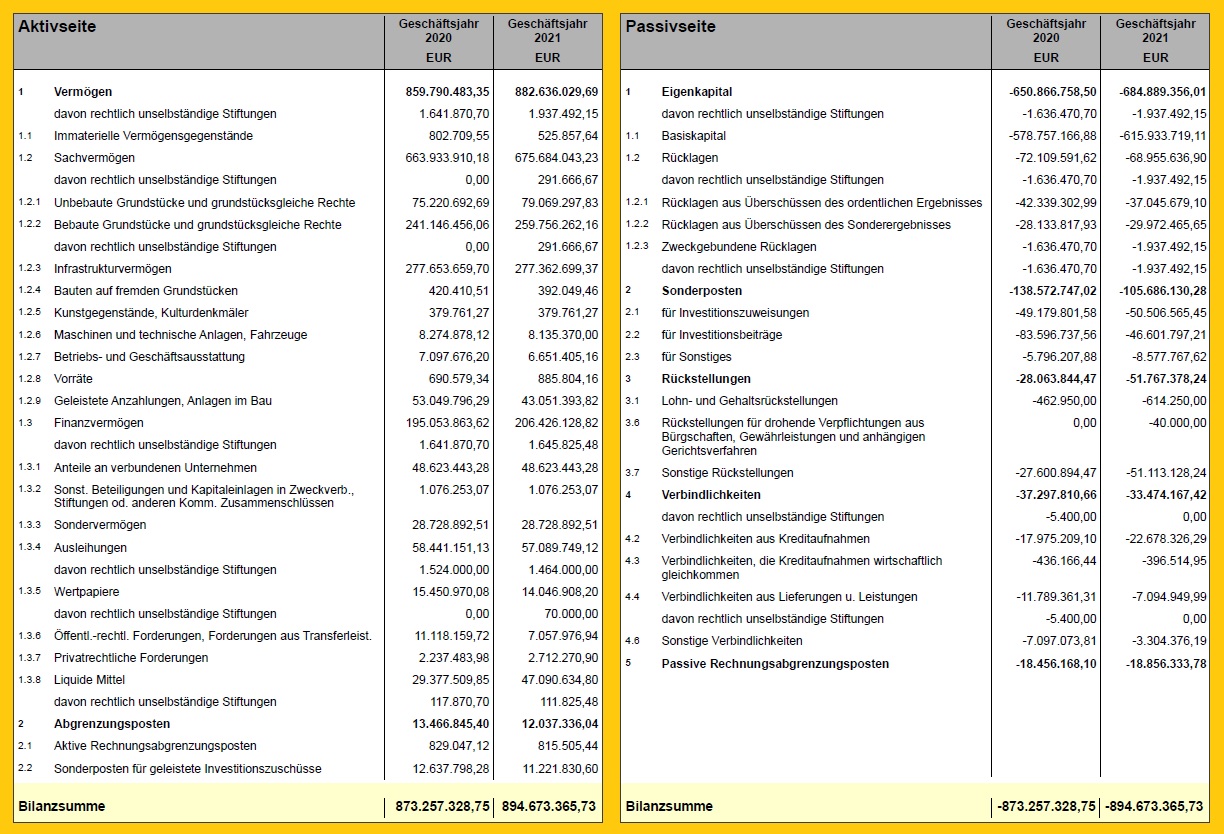 Das Sachvermögen der Stadt (Gebäude, Straßen, Grünanlagen, Fahrzeuge und weitere) hat sich um 11,8 Millionen Euro vergrößert, das Finanzvermögen (Beteiligungen, Ausleihungen, Forderungen, liquide Mittel) erhöhte sich um 11,4 Millionen Euro.