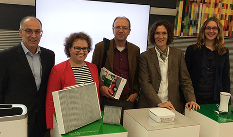 Zu Besuch bei MANN+HUMMEL: Redakteur Heiko Fritze (Mitte) mit Karlheinz Münkel (von links) und Dr. Patricie Merkert, Leiterin Neue Geschäftsfelder M+H, Dr. Andrea Bräuning (Living LaB/Bosch GmbH) und Verena Neubauer, Projektbetreuerin im Living LaB.
