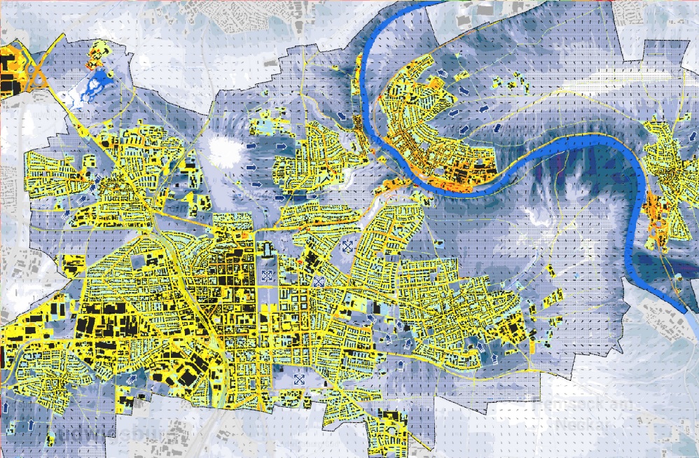 - Für die Klimaanalysekarten wurden, mit Hilfe eines Stadtklimamodells, Ergebnisse für die wichtigsten meteorologischen Parameter wie Windgeschwindigkeit und Kaltluftvolumenstrom berechnet.