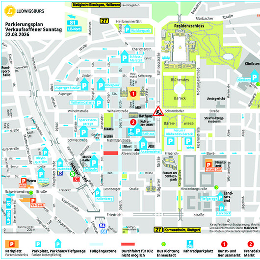 Bitte nutzen Sie öffentliche Verkehrsmittel - zum Beispiel mit dem günstigen Stadtticket. Es gibt am Rand der Innenstadt kostenlose Parkplätze, an denen man auf die Buslinien ins Zentrum umsteigen kann. Am Rathaus ist ein Fahrradparkplatz eingerichtet.