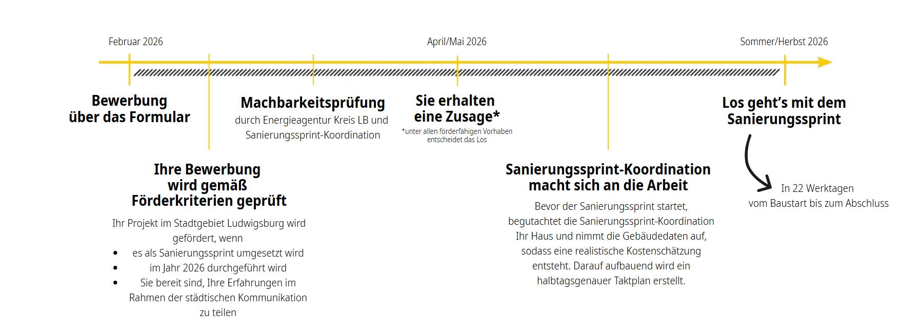 Voraussetzung für die Förderung ist, dass Ihr Sanierungsprojekt im Stadtgebiet Ludwigsburg mit einer Sanierungssprint-Koordination als Sanierungssprint in 22 Werktagen geplant wird.. Die Sanierung muss im Jahr 2026 durchgeführt werden. Die Förderung ist nur für selbst genutzten Wohneigentum in Ein- und Zweifamilienhäusern möglich.Zudem ist mit der Förderung verbunden, dass Ihr Sanierungssprint in der städtischen Kommunikation als Beispiel vorgestellt wird. Ziel ist, zu zeigen, wie Sanieren im Schnellformat in Ludwigsburg funktionieren kann – nahbar, verständlich und praxisorientiert. Mögliche Formate sind zum Beispiel: Fotodokumentation: Vorher-Nachher-Fotos Ihres Hauses, Einblicke in die 22 Tage auf der Baustelle, ggf. ein kleines „22-Tage-Buch“ mit ausgewählten Motiven.
