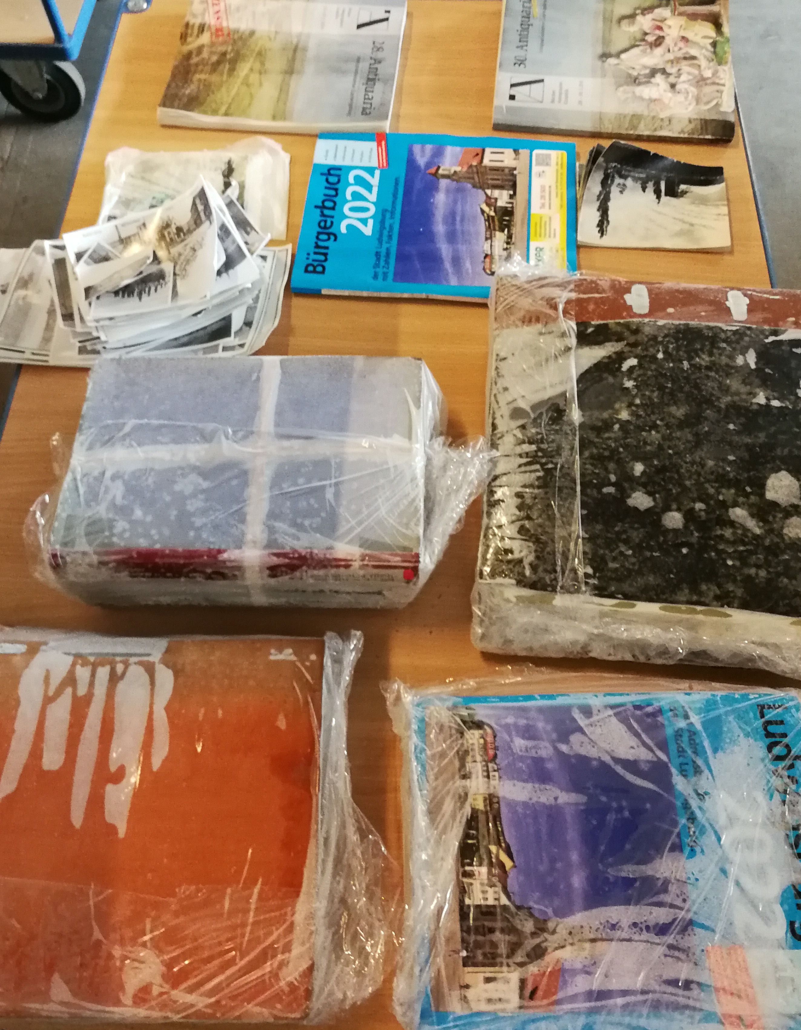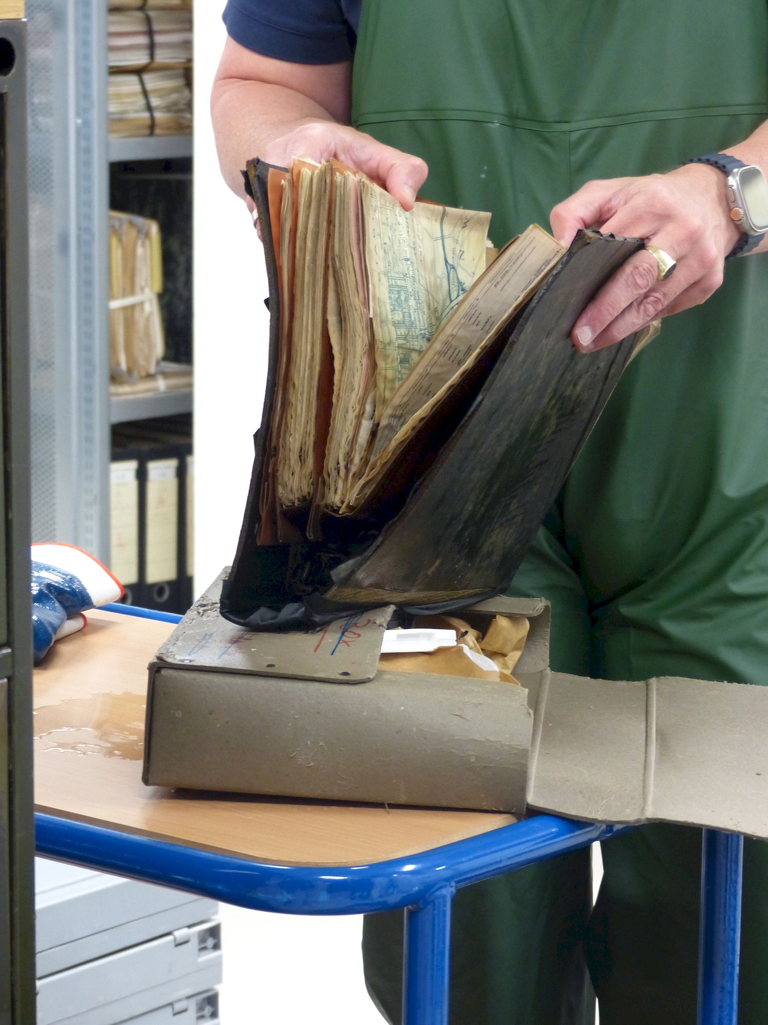 Das Team des Stadtarchivs Ludwigsburg sowie die hauptamtliche Abteilung der Ludwigsburger Feuerwehr übten am 21.06.2023 unter Anleitung eines externen Dienstleisters die Rettung von Archivalien nach einem Wassereintritt. Vor dem Hintergrund extremer werdenden Wetterereignissen, ist eine Schulung der Mitarbeiter wichtig, um Abläufe für den Ernstfall einzuüben. Im Rahmen der Übung wurden nicht mehr benötigte Akten zuvor 48 Stunden gewässert. Nach Bergung der Akten, begannen die an der Übung Teilnehmenden mit der Folierung der einzelnen Akteneinheiten. Anschließend wurden die Akteneinheiten in Spezialkartons für den Weitertransport in ein Kühllager verpackt.
