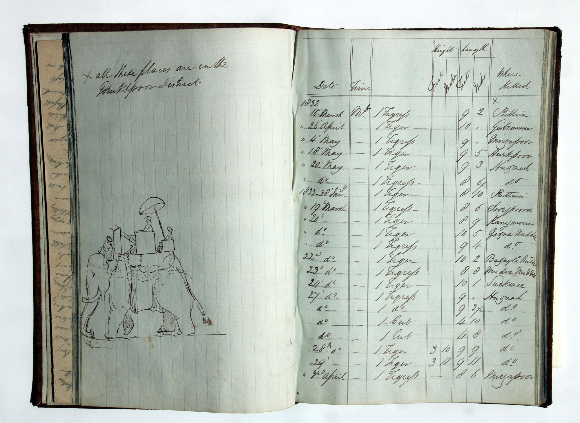 Während seiner Freizeit zog er auf einem Elefanten zur Tigerjagd in den Dschungel. Die Jagderfolge wurden akribisch in einem Buch verzeichnet. Neben einer Skizze des Elefanten, sind auch ein paar Borsten erhalten geblieben und erinnern an das aus heutiger Sicht etwas kuriose „Freizeitvergnügen“ im Dschungel.
