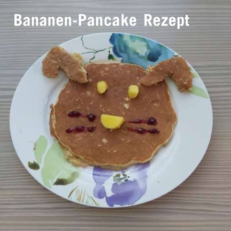 Leckere Bananen-Pancakes selber backen: Mit wenigen Zutaten könnt ihr so ein leckeres Frühstück zaubern. Die Pancakes lassen sich wunderbar zu lustigen Tiergesichtern formen. Bitte nur mit Mama oder Papa zusammen nachbacken. Ihr braucht dafür: 1 Banane, 2 Eier, 1 EL Mehl, 3 EL Haferflocken, 1 Schüssel, 1 Pfanne, 1 Gabel.