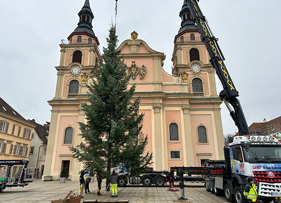 Momentan laufen die Vorbereitungen für den Weihnachtsmarkt auf Hochtouren. Seit Mittwoch, 13. November, steht bereits der große Christbaum auf dem Marktplatz. Die circa 16 Meter hohe Küstentanne stammt wie in den vergangenen drei Jahren aus dem Forstrevier Reichenberg in Oppenweiler (Rems-Murr-Kreis). Der dortige Förster hat den Weihnachtsbaum gemeinsam mit Mitarbeitenden der Technischen Dienste Ludwigsburg (TDL) ausgesucht. Der Baum wurde mit einem Tieflader nach Ludwigsburg transportiert und mit Hilfe eines Autokrans an seinen Platz vor der Stadtkirche auf dem Marktplatz gebracht. Von den Elektrikern der TDL wird er noch mit einer weihnachtlichen Lichterkette geschmückt.