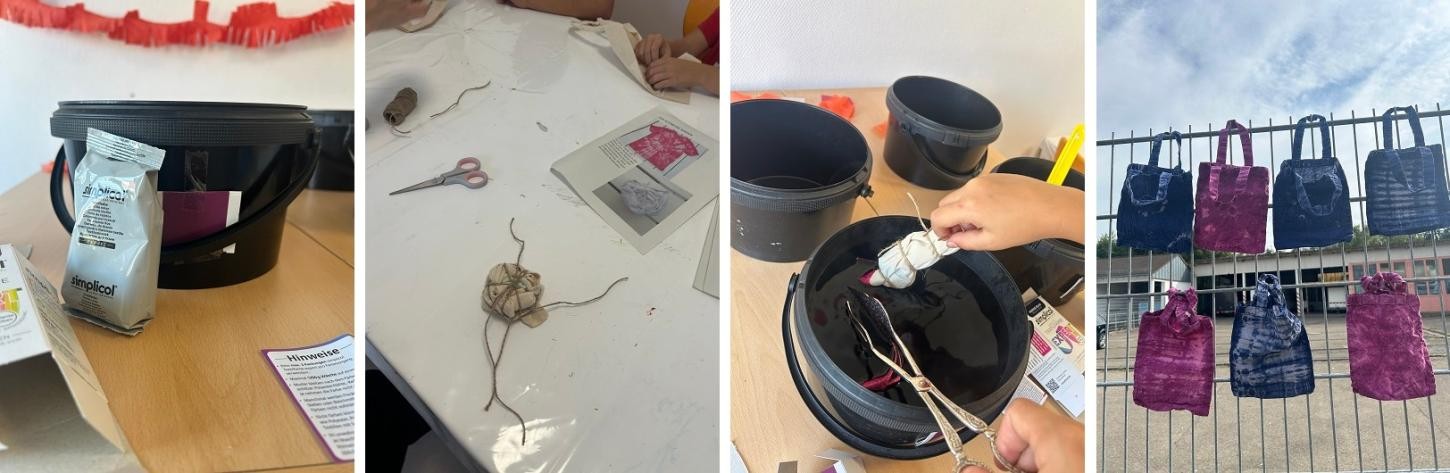 Beim Batiken durften die Kinder ihrer Kreativität freien Lauf lassen. Die weißen Taschen wurden geknotet und gewickelt und anschließend in Farbe getaucht. Die Kinder warteten ganz gespannt auf die fertigen Ergebnisse, die nun als Tasche für Sportsachen oder die Kuscheltiere verwendet werden kann.
