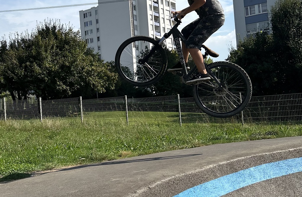 Eine Woche später ging es mit den Fahrrädern bei hohen Temperaturen zur Pumptrack in Eglosheim. Nach einigen Tricks ging es später auf den schattigen Spielplatz, um sich mit kühlem Wasser abzukühlen.
