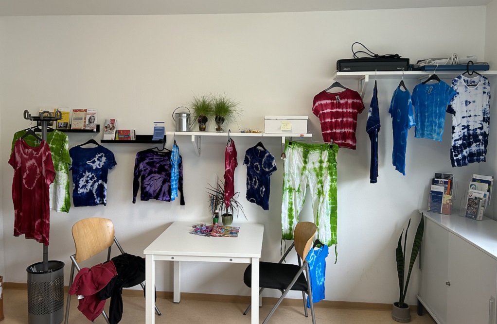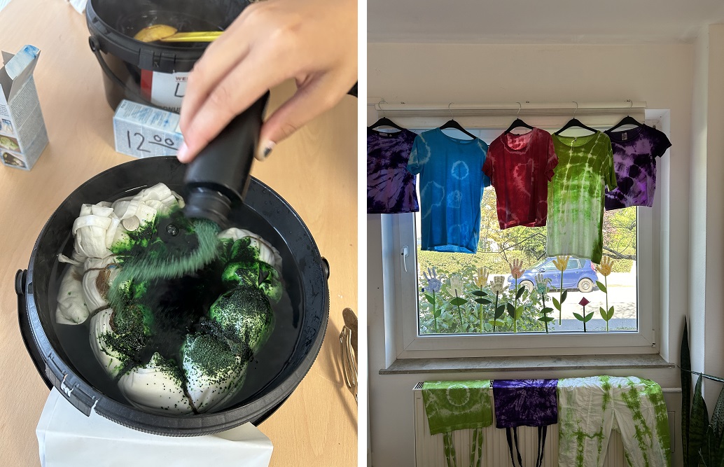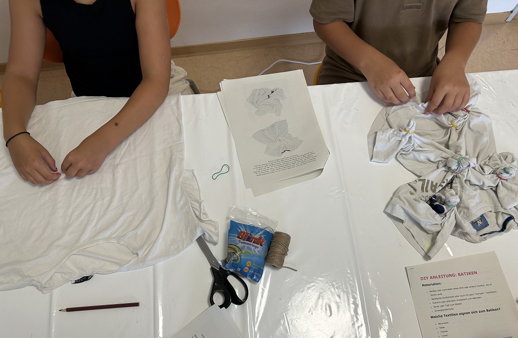 Ein Highlight war das gemeinsame Batiken. Jedes Kind durfte ein T-Shirt verknoten, gestalten und es anschließend in der selbst gewählten Farbe einfärben. Ergebnis waren tolle, individuelle T-Shirts.