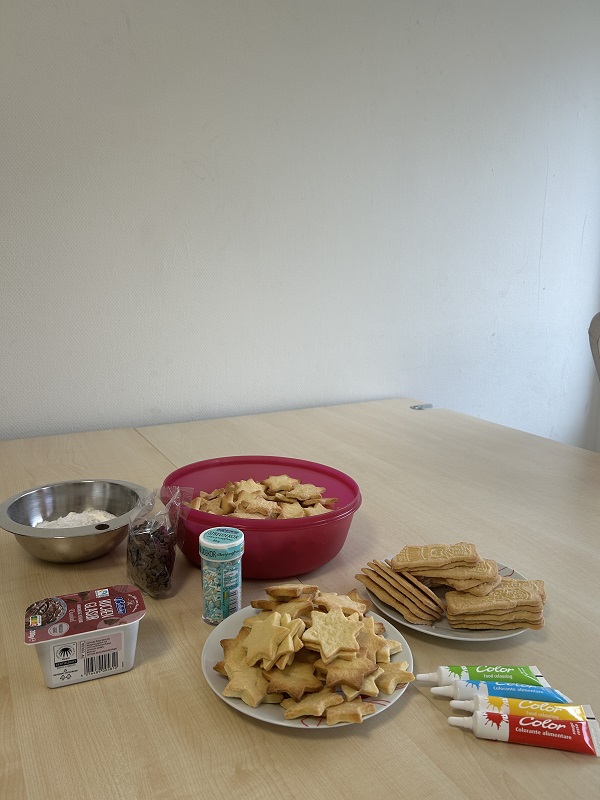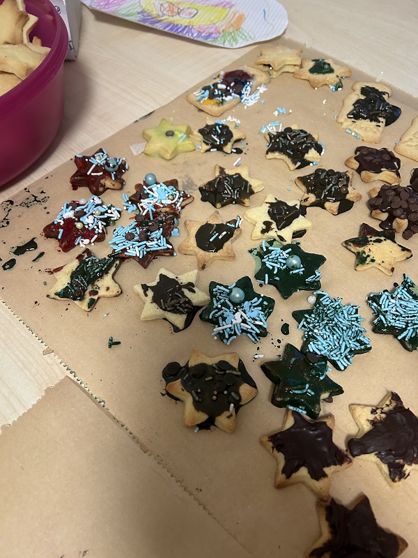 Für die Kinder startete die Adventszeit mit vielen weihnachtlichen Angeboten. Eingeläutet wurde mit dem weihnachtlichen Dekorieren der Unterkunft. Gemeinsam mit den Kindern und Eltern wurden bunte Lichterketten aufgehängt, Fenster weihnachtlich gestaltet und der Weihnachtsbaum festlich geschmückt. Dank der oben genannten IT-Firma wurde in diesem Jahr jedem Kind ein Weihnachtswunsch erfüllt. Hierfür wurden fleißig die Wunschsterne ausgeschnitten und gestaltet, die später auch einen Platz am Baum fanden. Es wurden gemeinsam dreierlei Sorten Plätzchen gebacken, dafür zusammen die Zutaten abgewogen, der Teig geknetet, ausgerollt und ausgestochen. Highlight für die Kinder war das Dekorieren der Plätzchen am Ende.