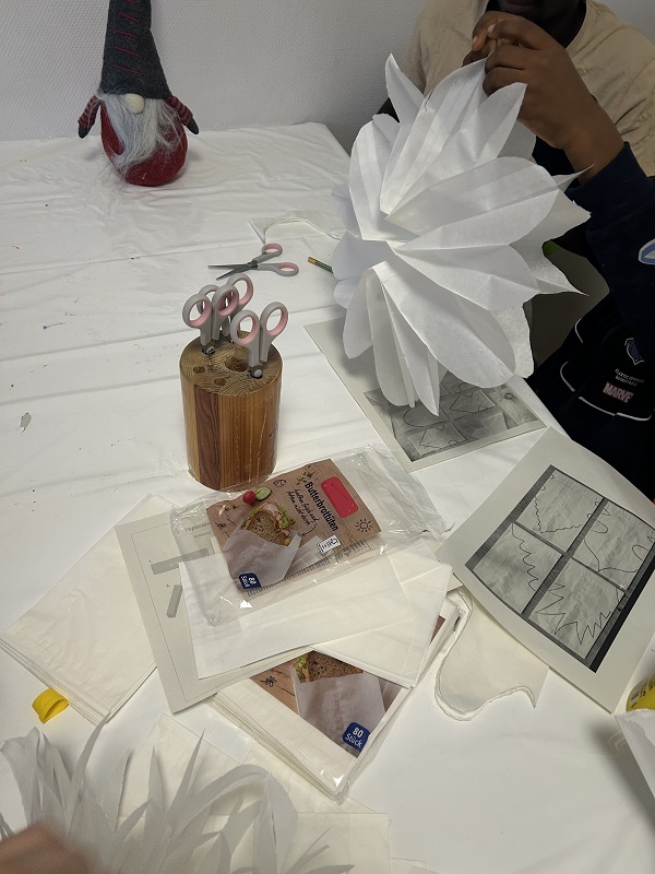 Das winterliche Butterbrot-Stern-Basteln im Kreativangebot lies einige prächtige Sternaufhänger entstehen, bei dem keiner dem anderen glich. Jede Form, jeder Schnitt und jede Idee brachte die Kinder dazu, experimentierfreudig zu werden, gemeinsam zu basteln und neue kreative Seiten an sich zu entdecken. Zusammen mit ihren Eltern oder Freund* innen haben sich die Kinder Zeit genommen, am großen Basteltisch zu kleben und zu schneiden. Die schönen, schneeweiß strahlenden Sterne hängen nun in den Zimmern der Kinder und verzaubern sie zu einem schön dekorierten kleinen Winterzauberland.