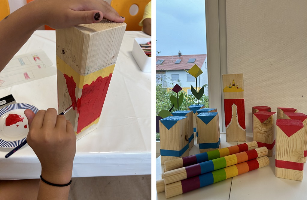Ganz schön anstrengend wurde es beim Bauen des Wikingerschachs. Hier wurde fleißig abgemessen, gesägt und geschmirgelt. Anschließend wurden die Wurfstäbe und Kubb’s bunt angemalt. Die Vorlage für das Design wurde von einer Teilnehmerin erstellt. Bei der anschließenden Einweihung hatten alle viel Spaß.