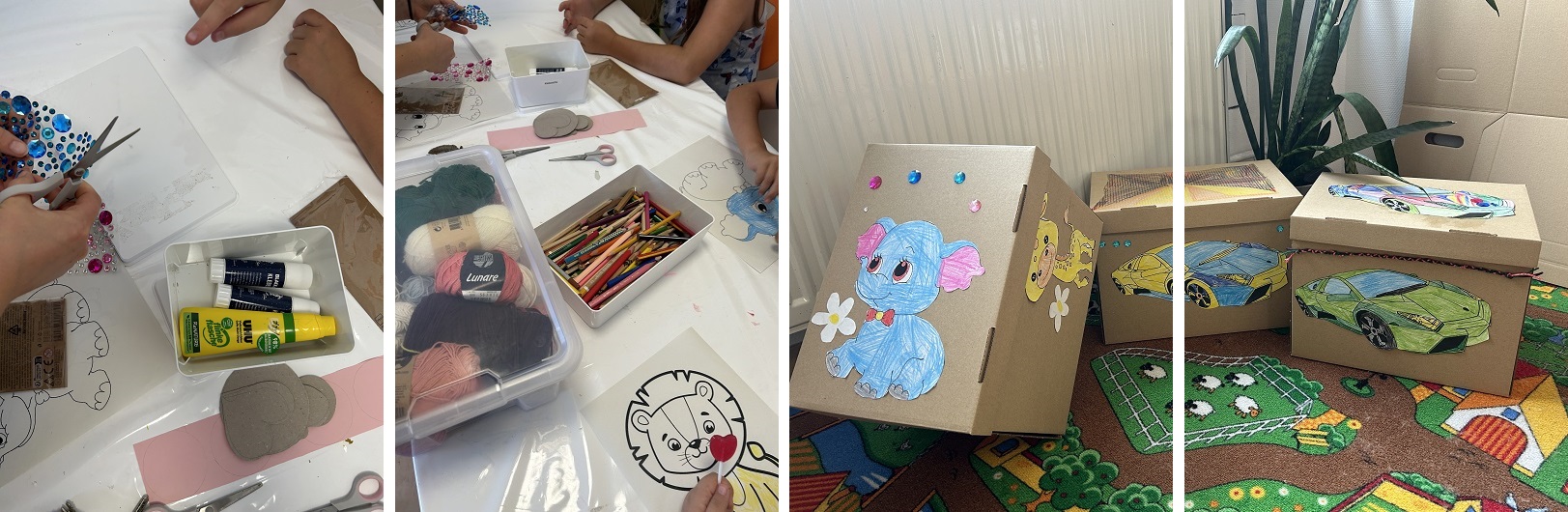 Zum Abschluss des Ferienprogramms hatte jedes Kind die Möglichkeit seinen eigenen Karton zu gestalten. Mit Bildern, Basteleien, Fäden und Glitzersteinen wurden die Boxen zu tollen Unikaten gestaltet. Hier finden nun die eigenen Spielzeuge, Bastelmaterialien und Bilder ihren Platz.