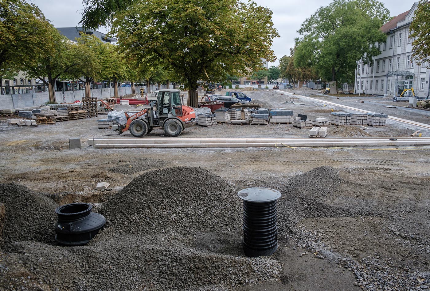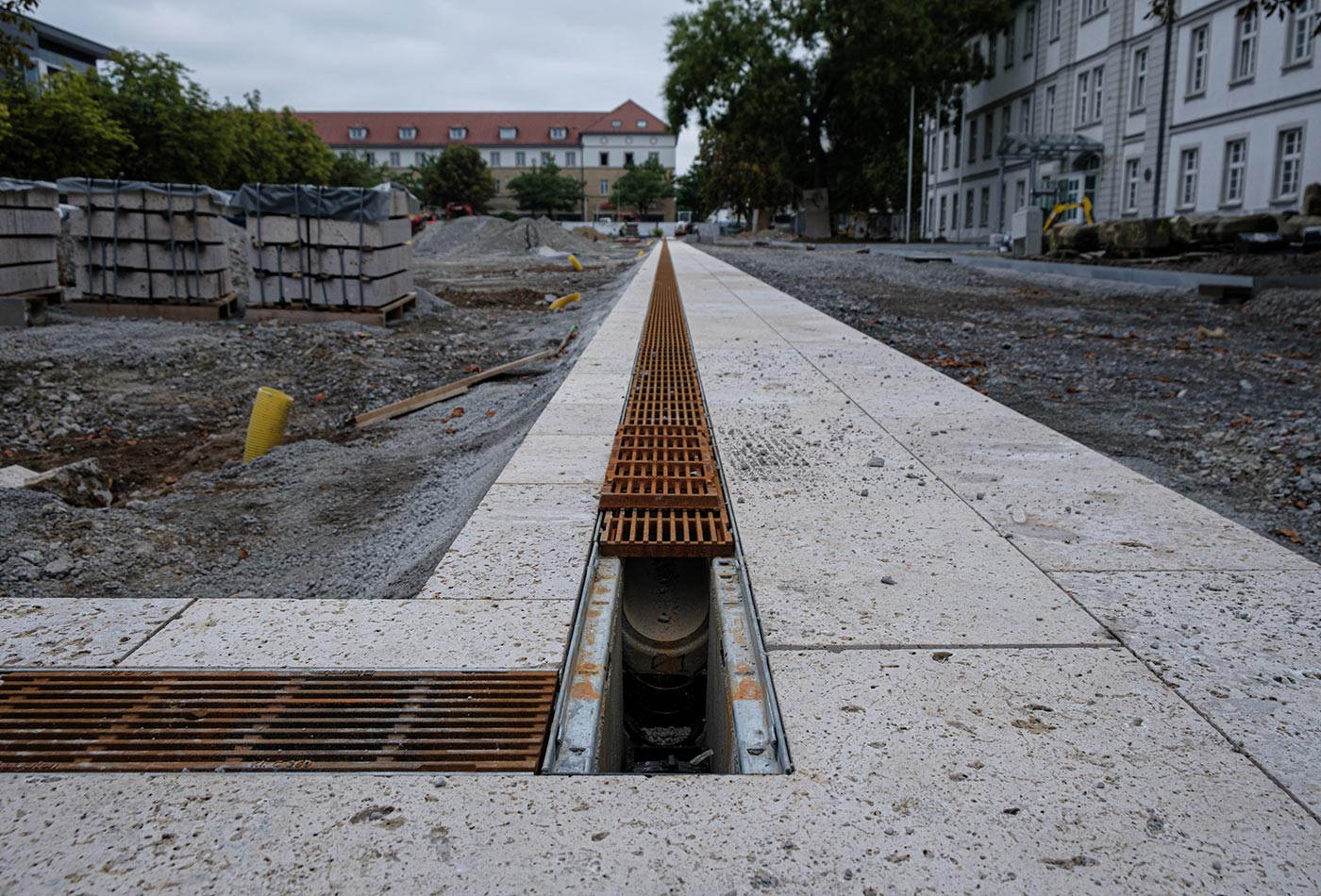 Rund um den Baumhain verläuft ein 60 cm breites Steinband aus hellem Travertin-Naturstein. Wo Höhenunterschiede bestehen, bekommt das Steinband Stufen. Bei gleicher Höhe wird der Naturstein als ein ebenes Plattenband verlegt. Im Steinband befindet sich eine Entwässerungsrinne. Im Vordergrund des Bildes sieht man die Öffnungen der Regenwasserzisterne.