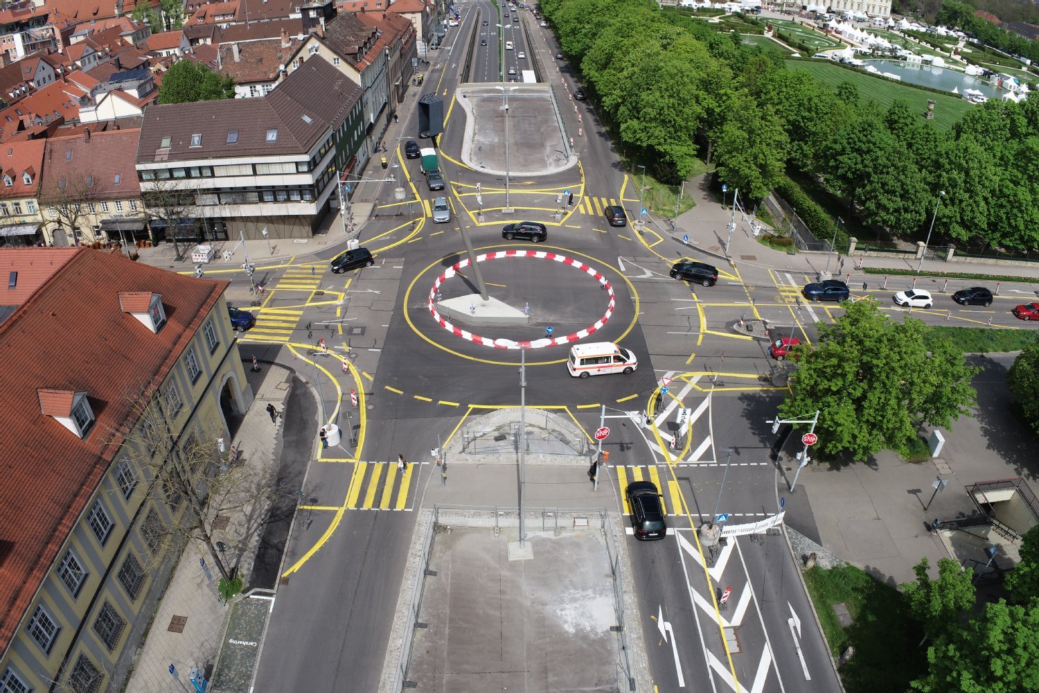 Der Kreisverkehr ist eingerichtet! Endlich hat alles gepasst: Der provisorische Kreisverkehr ist eingerichtet und erste Verbesserungen wurden auch bereits vorgenommen. Wir sind gespannt wie der Versuch verlaufen wird.
