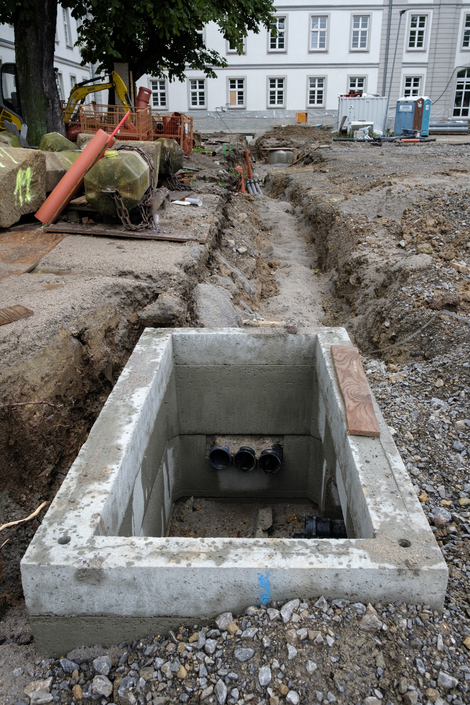 Außerdem werden aktuell Leerrohre für die Platzbeleuchtung, die Festplatzanschlüsse, den Trinkbrunnen und die Brunnenanlage verlegt. Die Kabel werden später eingezogen und angeschlossen.