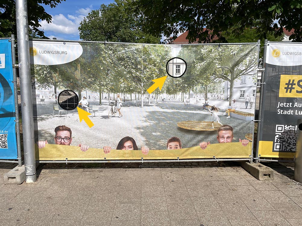 Spicken erlaubt! Einblick in die Baustelle: Der Bauzaun hat jetzt sechs Gucklöcher, zwei an der Wilhelmstraße und vier an der Arsenalstraße.