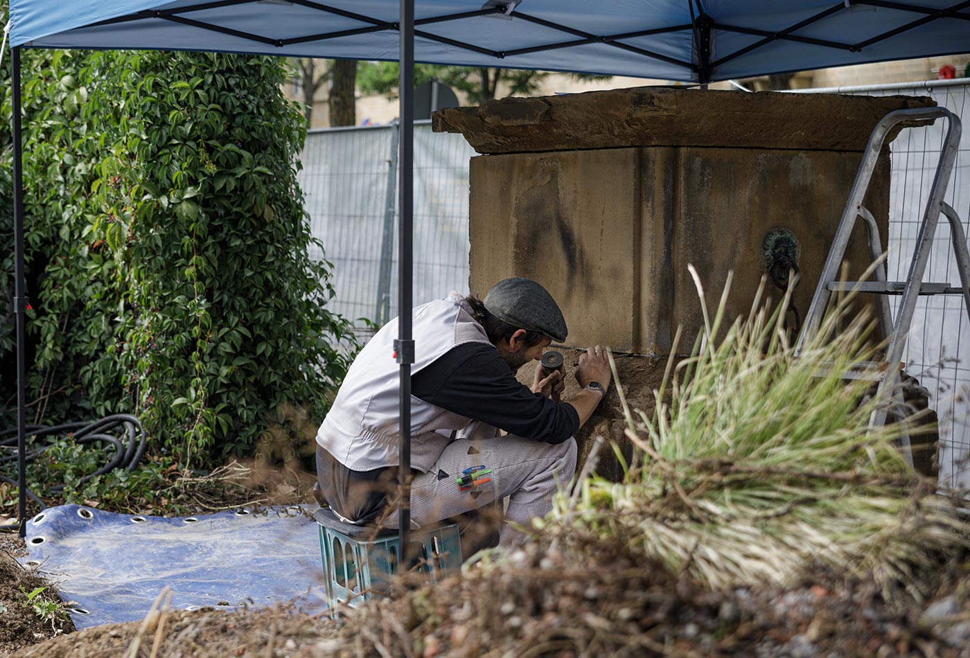 Nach erfolgter Sanierung werden sie wieder auf die Platzfläche im Baumhain gesetzt. Die Postamente werden zurzeit an Ort und Stelle gereinigt und saniert.