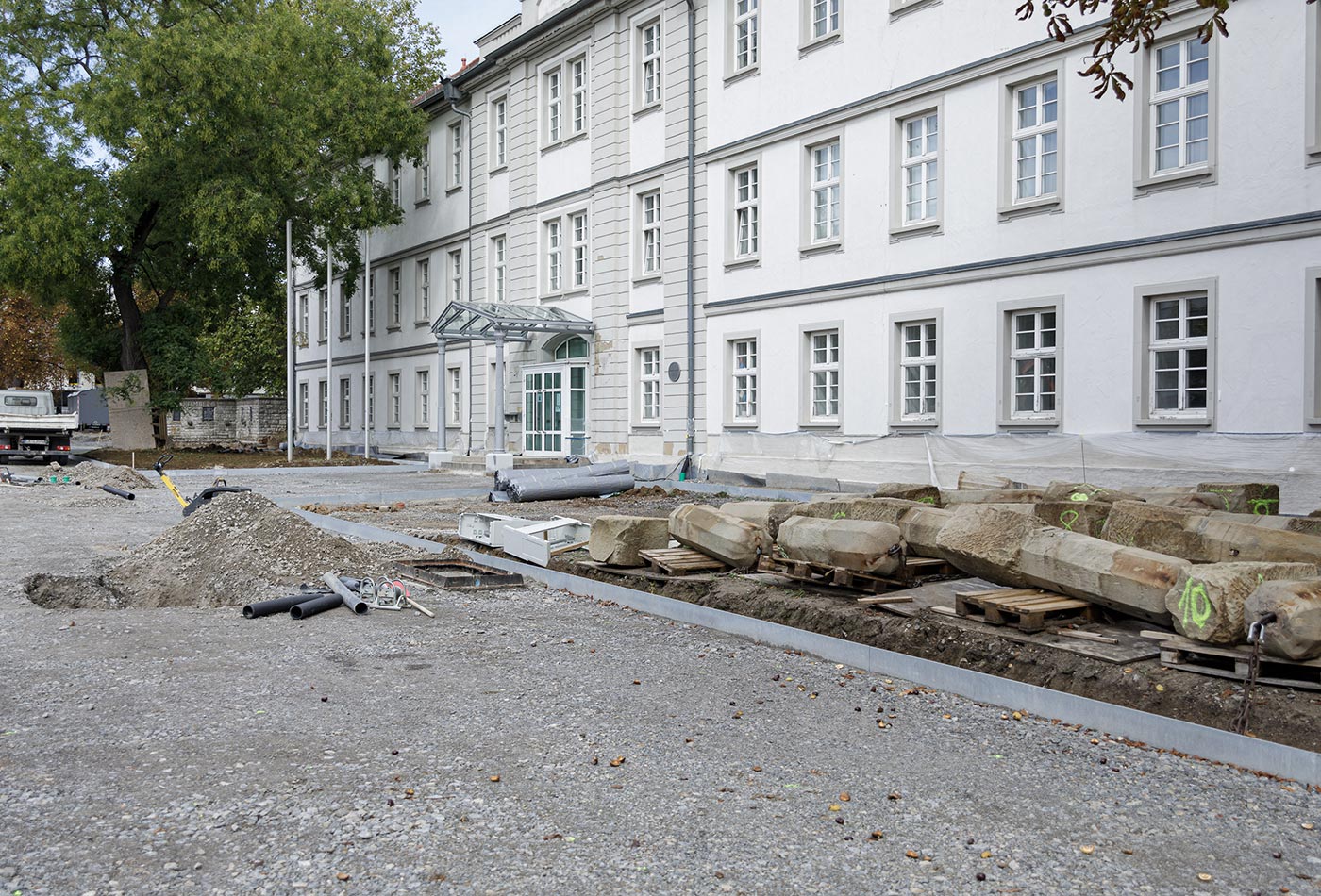 Die historischen und denkmalgeschützten Poller und Postamente werden auch nach der Neugestaltung auf dem Arsenalplatz verbleiben. Die Poller wurden ausgebaut und für eine Reinigung und Sanierung seitlich gelagert.