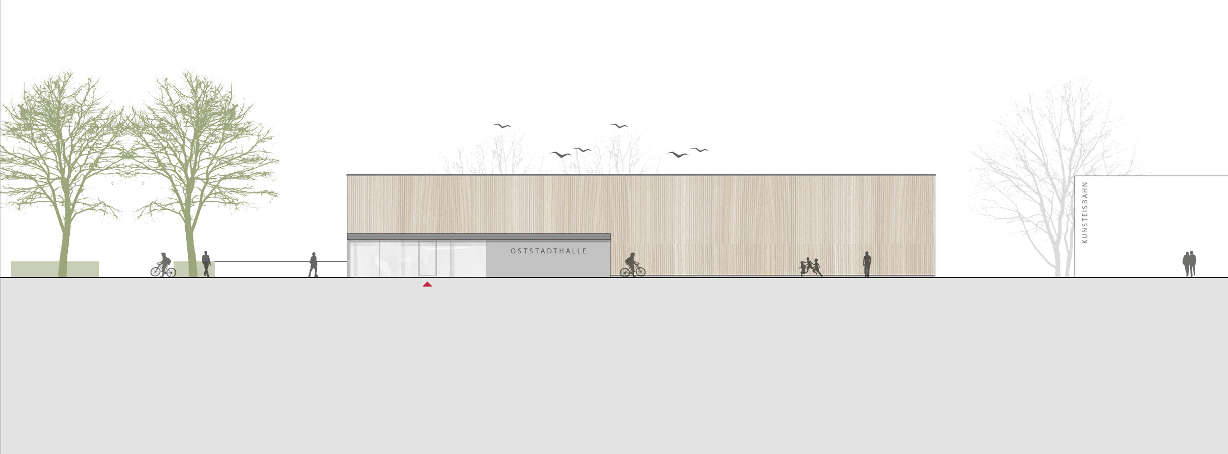 Der Eingangsbereich erhält einen einladenden und kommunikativen Charakter und wird über einen ansprechenden Vorbereich barrierefrei von Osten über das Stadion erschlossen. Auf der Zugangsebene zur Sporthalle befinden sich die Umkleideräume, die Tribüne mit bis zu 199 Zuschauerplätzen, sowie die Cafeteria. Auf der unteren Ebene sind neben den drei Sportfeldern die Geräteräume, weitere Funktionsräume und Technikräume angeordnet. Die beiden Geschosse sind über einen Aufzug barrierefrei miteinander verbunden. Die notwendigen Stellplätze werden im Umfeld der Halle nachgewiesen. Für Fahrräder befinden sich Abstellmöglichkeiten direkt neben dem Eingang zur Sporthalle.